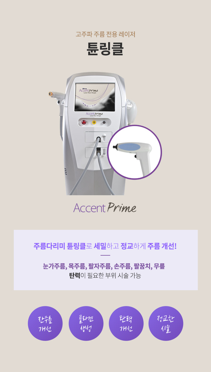 튠링클은 악센트 프라임(Accent Prime) 장비의 핸드피스를 활용한 고주파 시술입니다. 특히 얇고 민감한 눈가 주변 피부에 최적화된 시술로, 고주파 에너지를 진피층에 전달하여 콜라겐을 재생하고, 눈가 잔주름, 눈밑 꺼짐 등을 개선하는 것이 튠링클 원리의 핵심입니다.